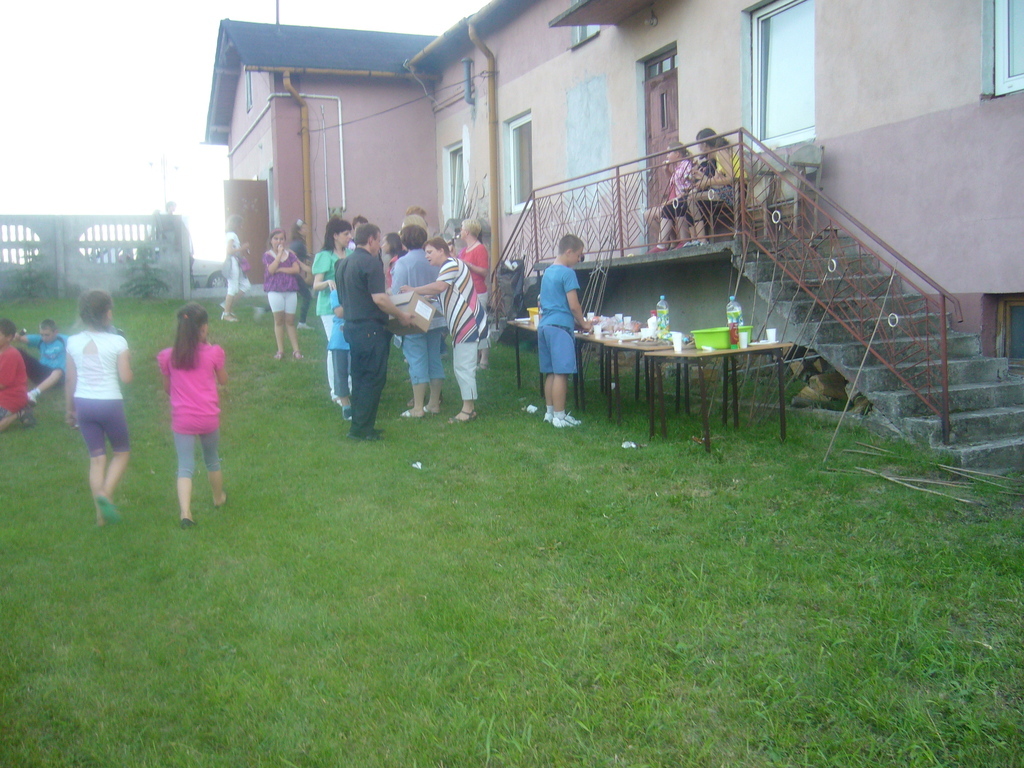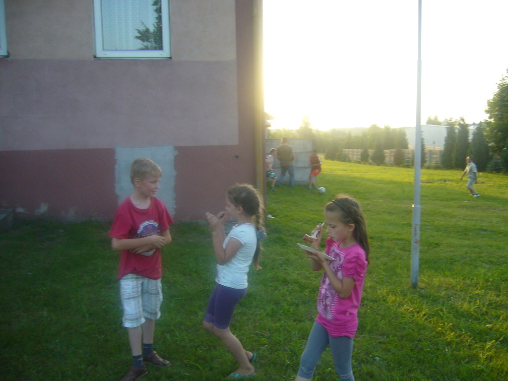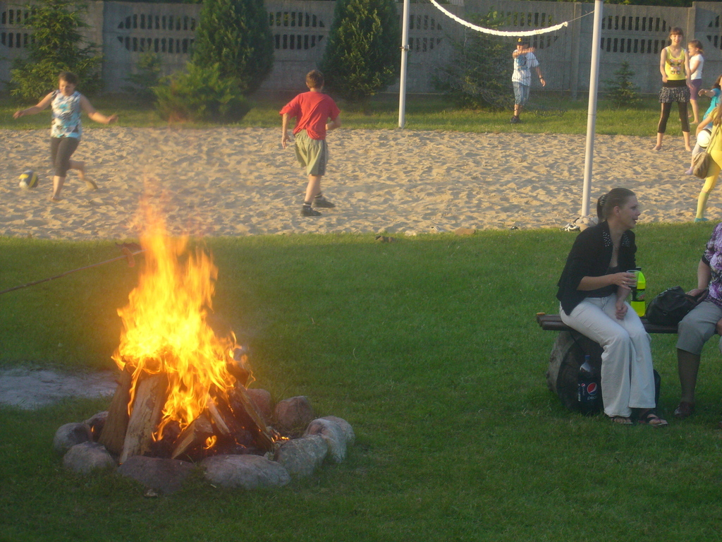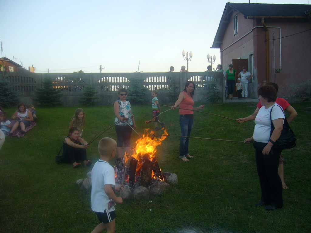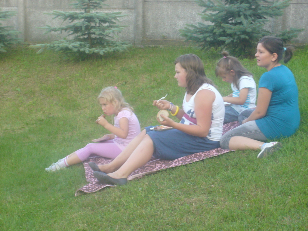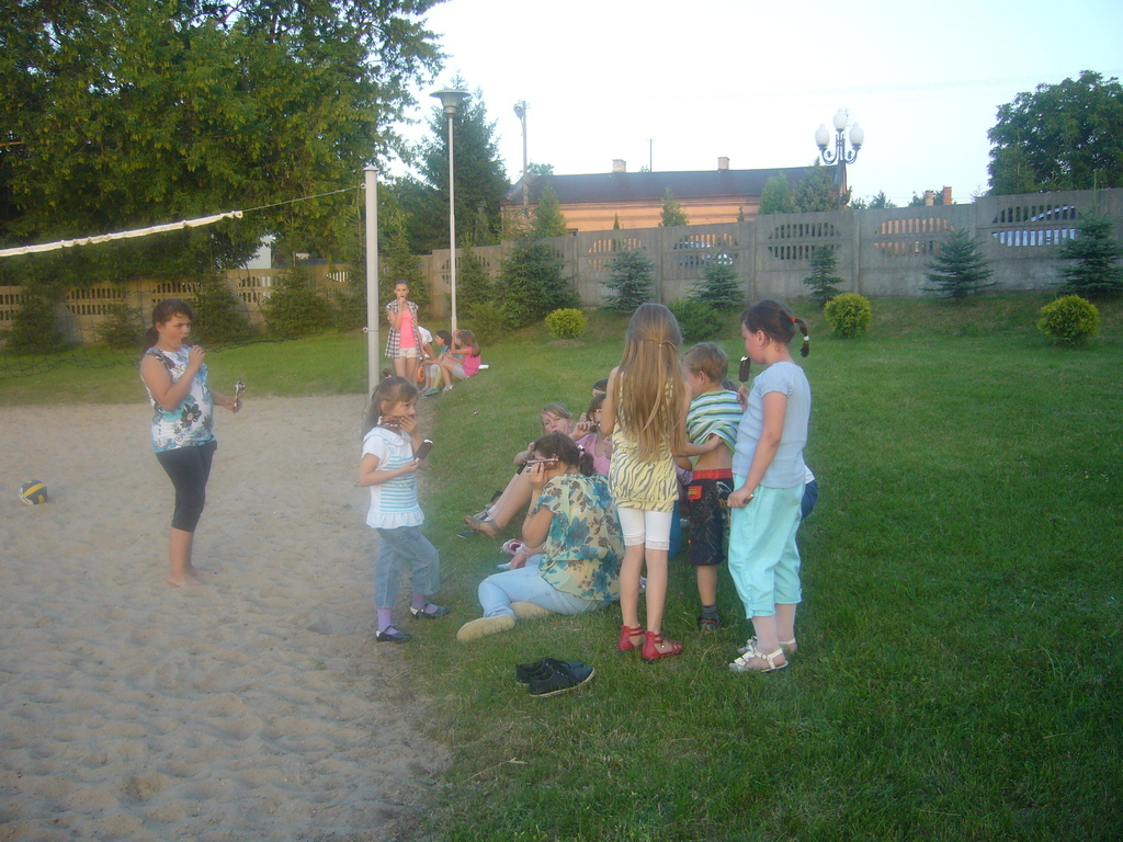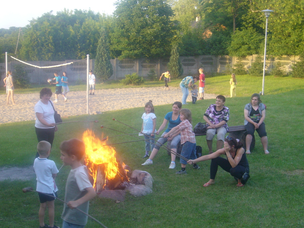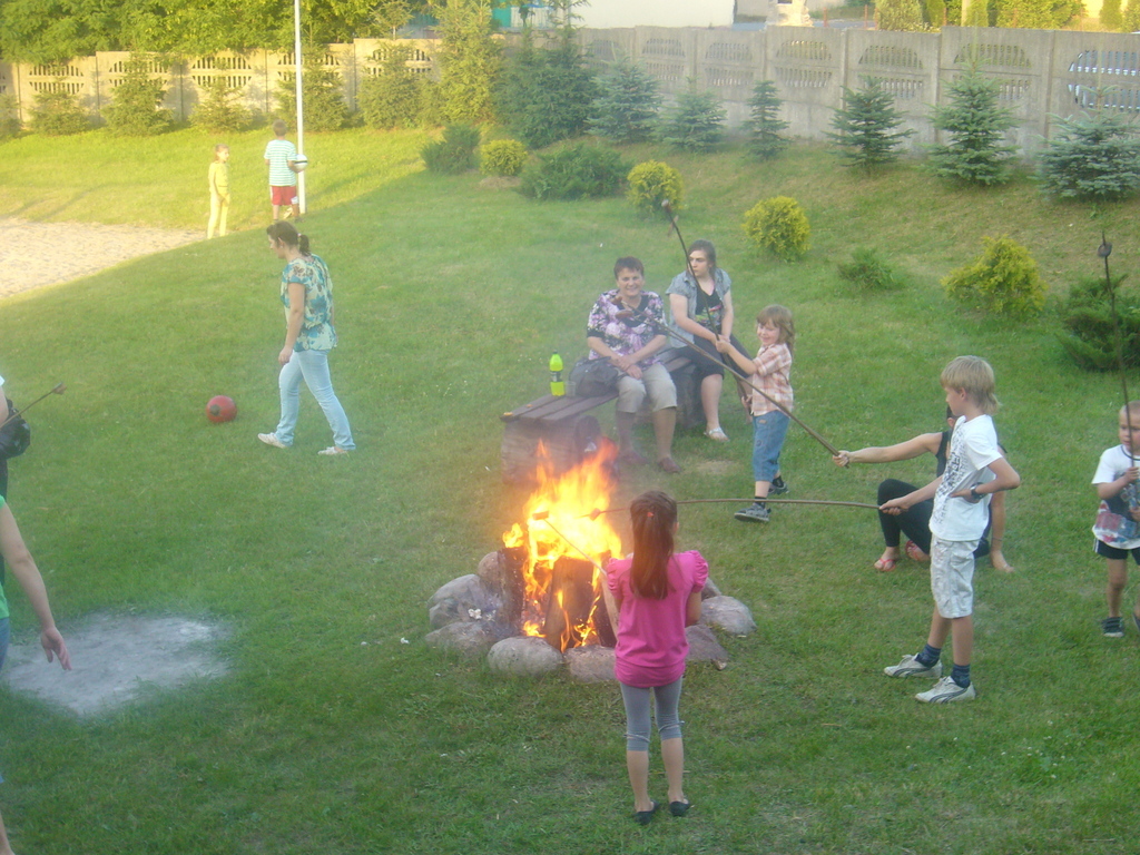 Następnie przeszliśmy do świetlicy, aby obejrzeć krótką bajkę, a na placu przy świetlicy zostało przygotowne ognisko oraz słodki poczęstunek. Po rozpaleniu ogniska wszyscy z wielką radością zabrali się do pieczenia kiełbasek rozsiadając się na wygrzanej przez słońce trawie. Po tym posiłku czekał na dzieci słodki deser, lody, którymi częstował ks. Wojciech. Aby aktywnie spędzić to popołudnie starsi chłopcy rozegrali mecz piłki nożnej, a pozostali korzystająć z pięknej słonecznej pogody grali w plażową piłkę siatkówkę. Dzieciom nie brakowało entuzjazmu i radości do wspólnych zabaw z racji rozpoczętych uroczyście upragnionych wakacji.