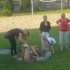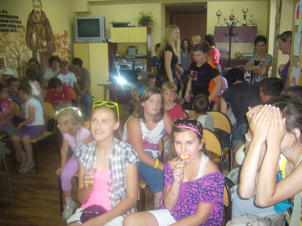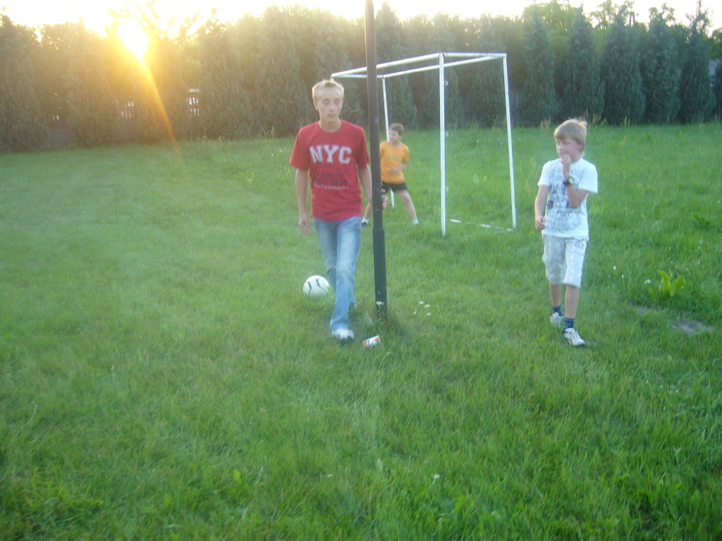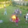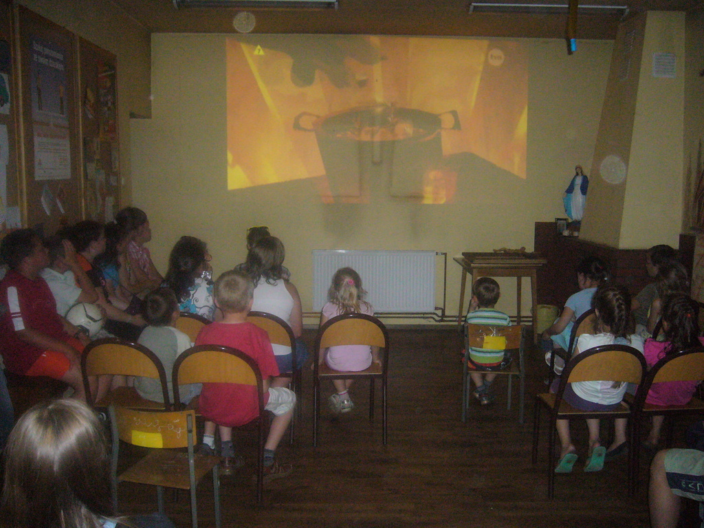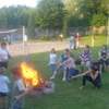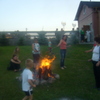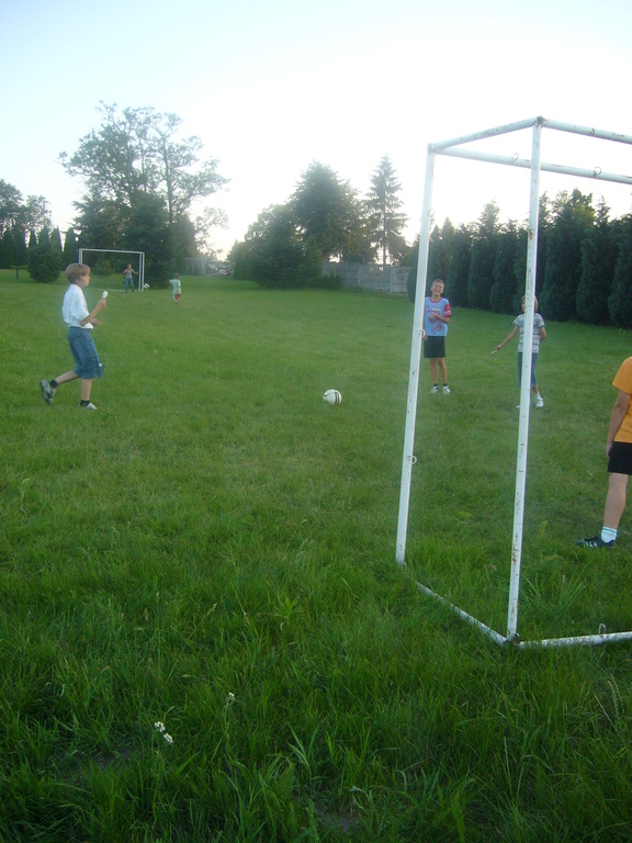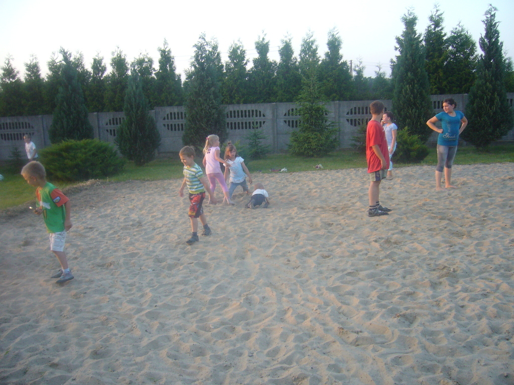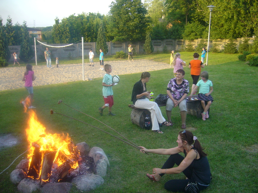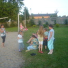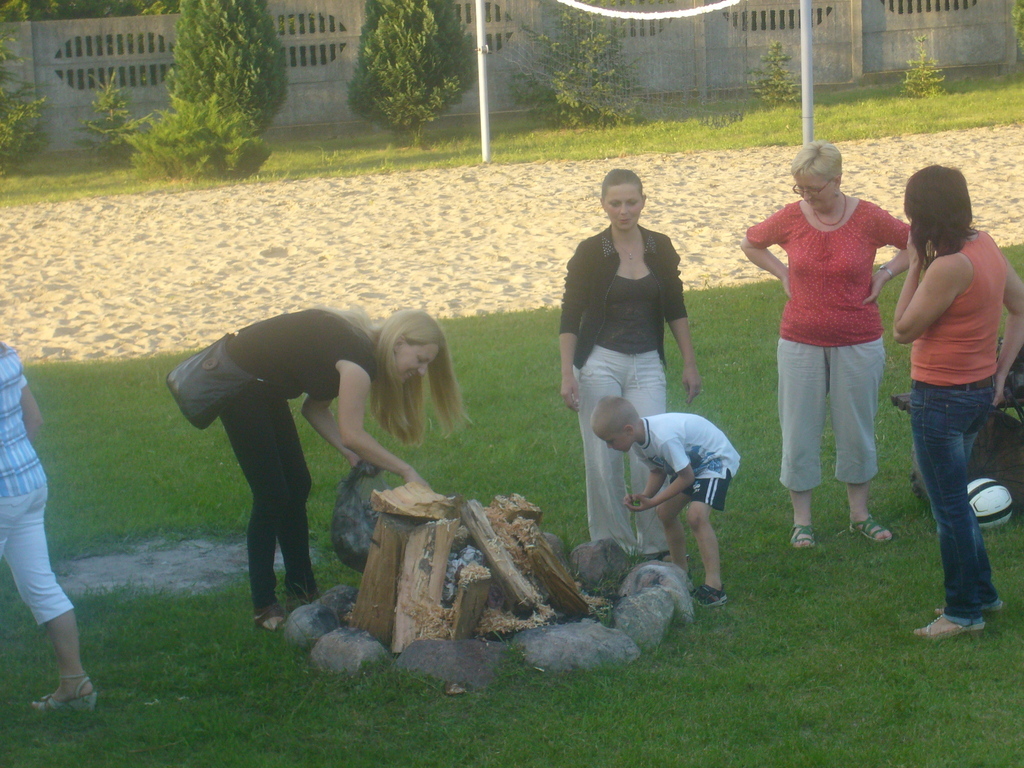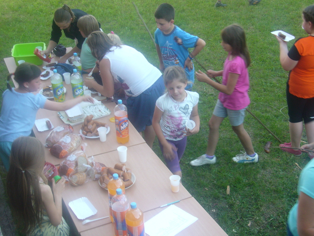 Następnie przeszliśmy do świetlicy, aby obejrzeć krótką bajkę, a na placu przy świetlicy zostało przygotowne ognisko oraz słodki poczęstunek. Po rozpaleniu ogniska wszyscy z wielką radością zabrali się do pieczenia kiełbasek rozsiadając się na wygrzanej przez słońce trawie. Po tym posiłku czekał na dzieci słodki deser, lody, którymi częstował ks. Wojciech. Aby aktywnie spędzić to popołudnie starsi chłopcy rozegrali mecz piłki nożnej, a pozostali korzystająć z pięknej słonecznej pogody grali w plażową piłkę siatkówkę. Dzieciom nie brakowało entuzjazmu i radości do wspólnych zabaw z racji rozpoczętych uroczyście upragnionych wakacji.