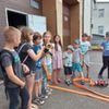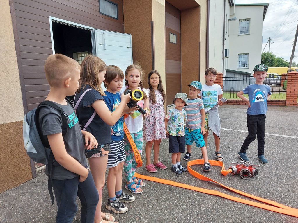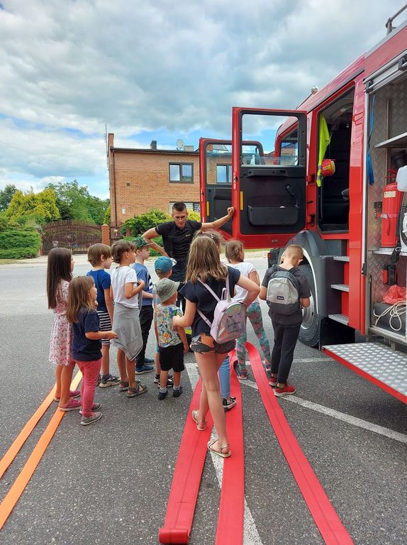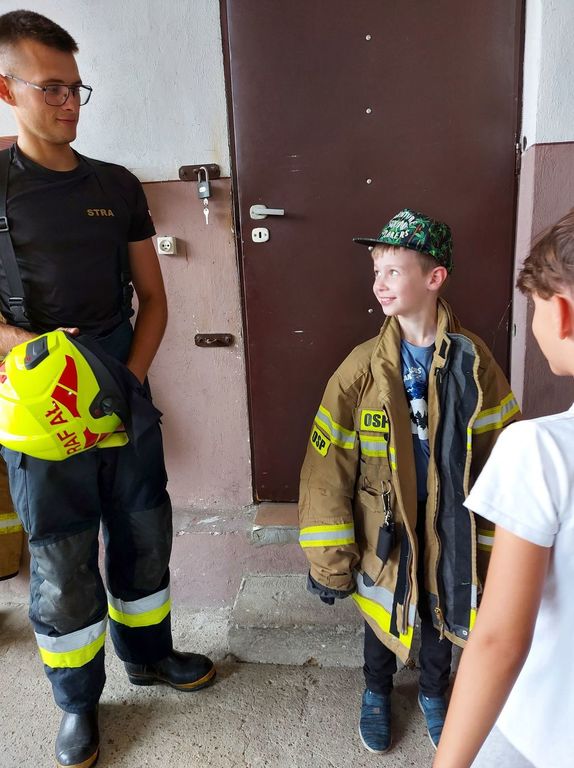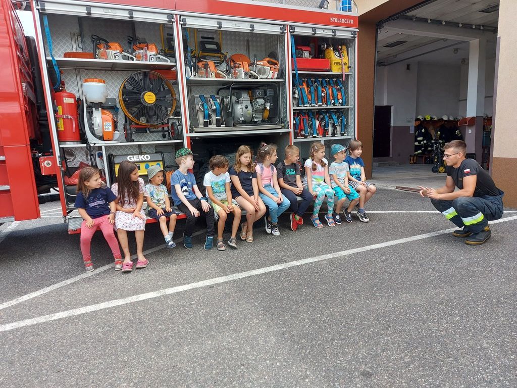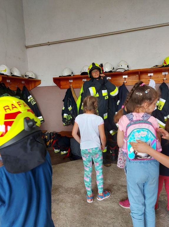 Odwiedziliśmy również naszych druhów z Ochotniczej Straży Pożarnej w Dmosinie. Dzieci bardzo nie mogły się doczekać tego spotkania. Druh Rafał, ciekawie opowiadał o pracy strażaków, zaprezentował nam działanie sprzętu, którym posługują się w trakcie akcji. Dzieci mogły przymierzyć stroje strażackie, jak również z pomocą strażaka zobaczyć jak się gasi pożar tzw. szybkim natarciem. Byliśmy bardzo zadowoleni z tego spotkania.