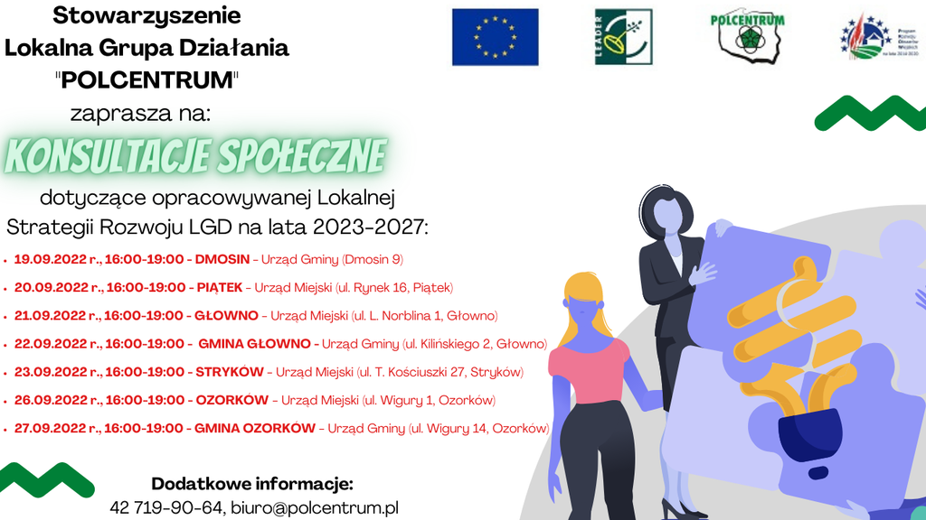 w ramach opracowywanej Lokalnej Strategii Rozwoju Lokalnej Grupy Działania „POLCENTRUM” na lata 2023 – 2027, serdecznie zapraszamy na konsultacje społeczne, które są poświęcone w szczególności analizie potrzeb rozwojowych i potencjału danego obszaru, a także celów strategii, w tym wymiernych celów końcowych dotyczących rezultatów oraz odnośnych planowanych działań.