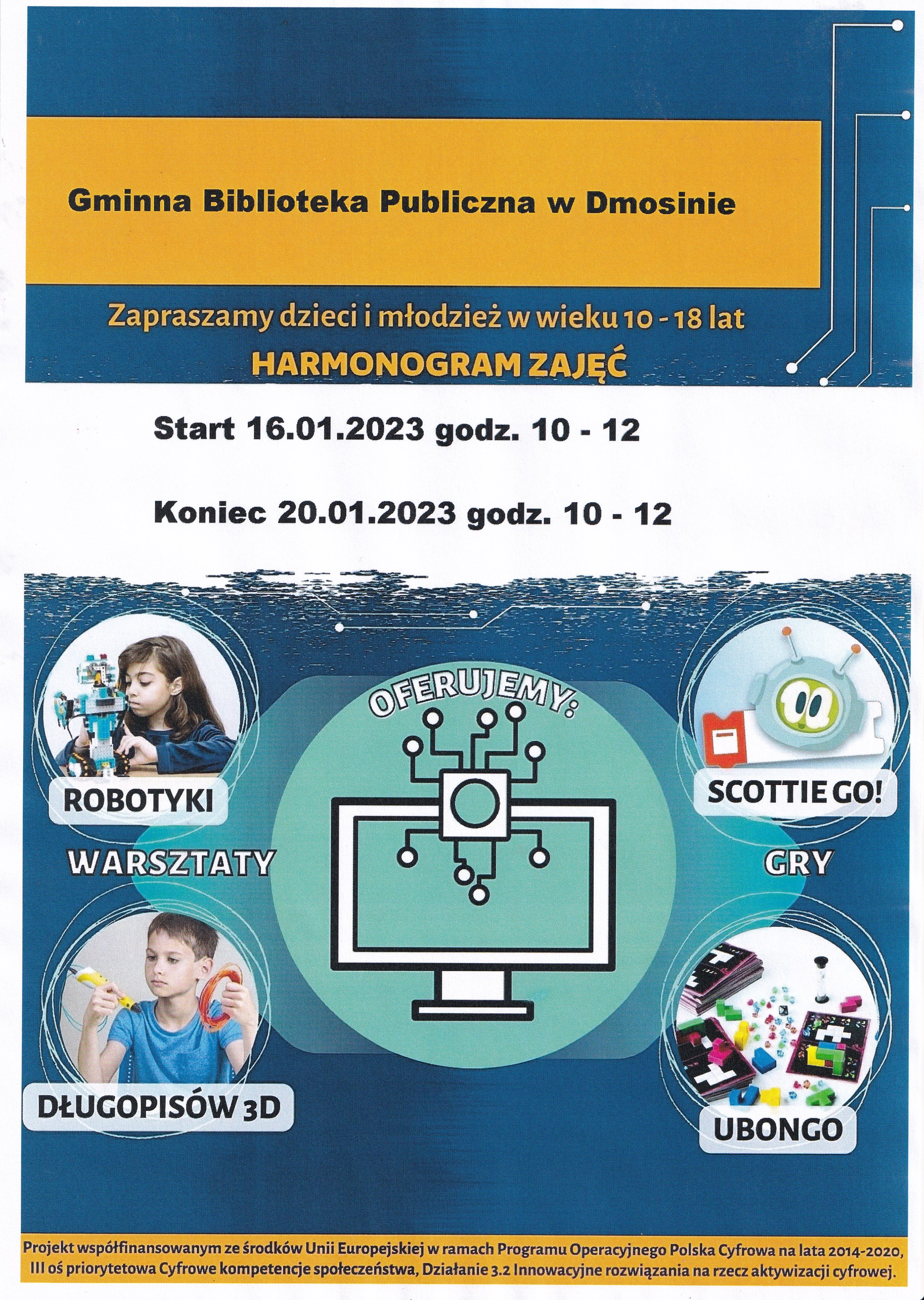 Serdecznie zapraszamy do udziału w zajęciach o tematyce programowania w czasie ferii zimowych. Zapisy w bibliotece do 12 stycznia 2023 roku. Liczba miejsc ograniczona.