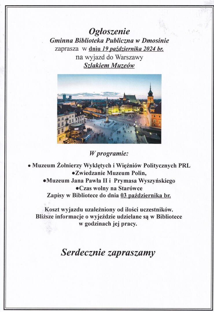 Serdecznie zapraszamy na wyjazd do Warszawy.