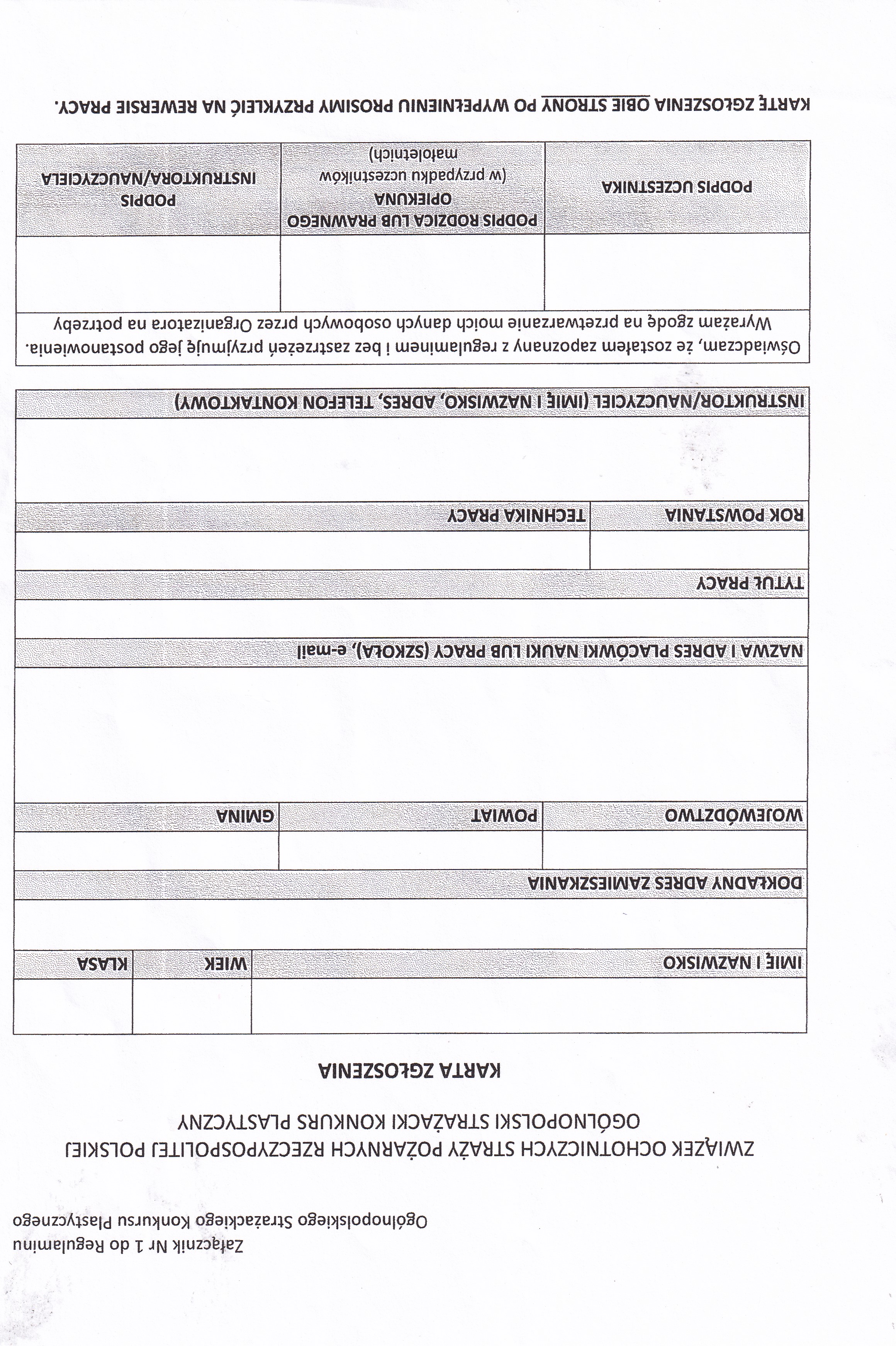 Każdy autor może samodzielnie wykonać i przesłać na konkurs od 1 do 3 prac plastycznych, które na odwrocie powinny być opatrzone czytelnie wypełnioną kartą zgłoszenia (załącznik nr 1).