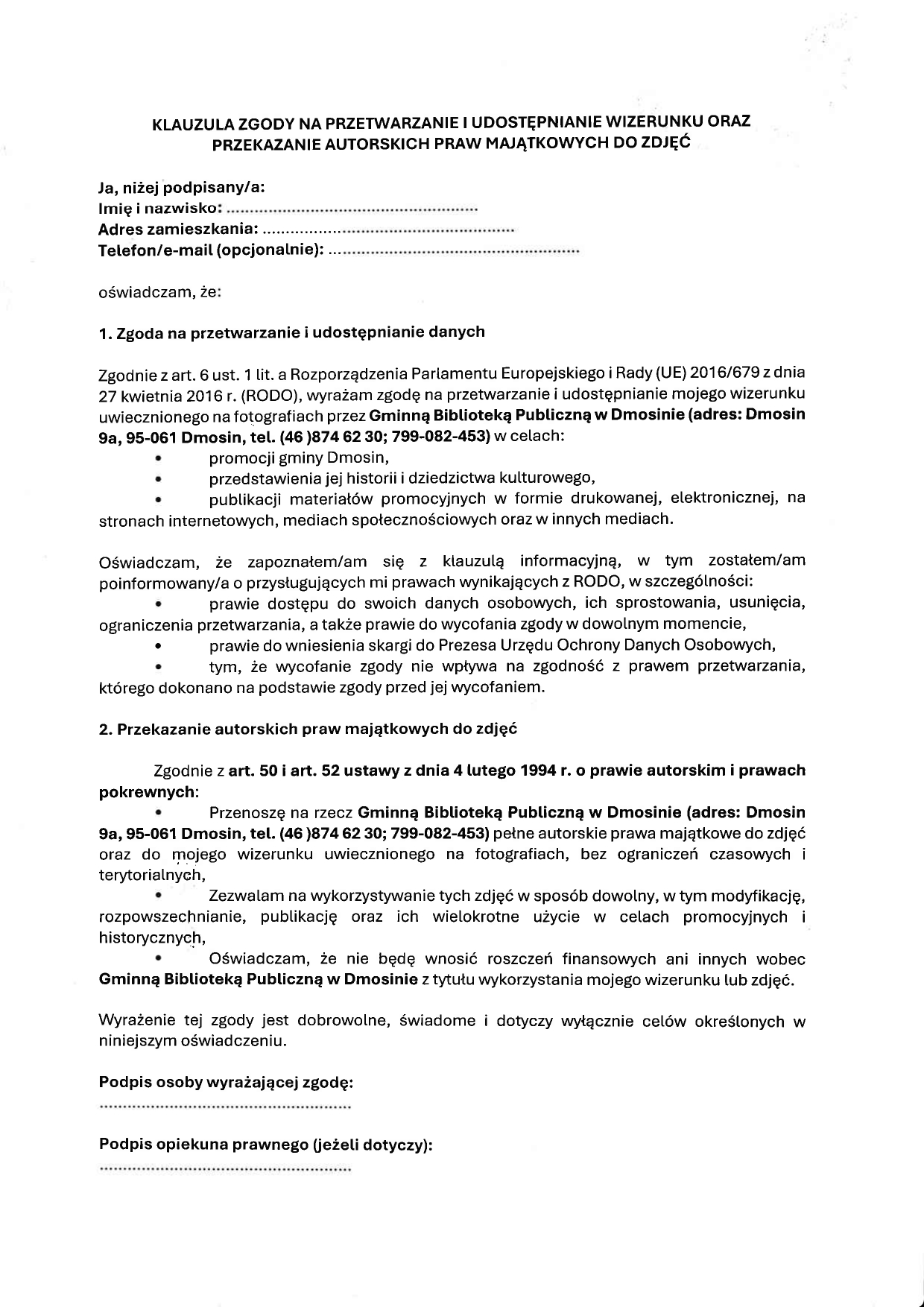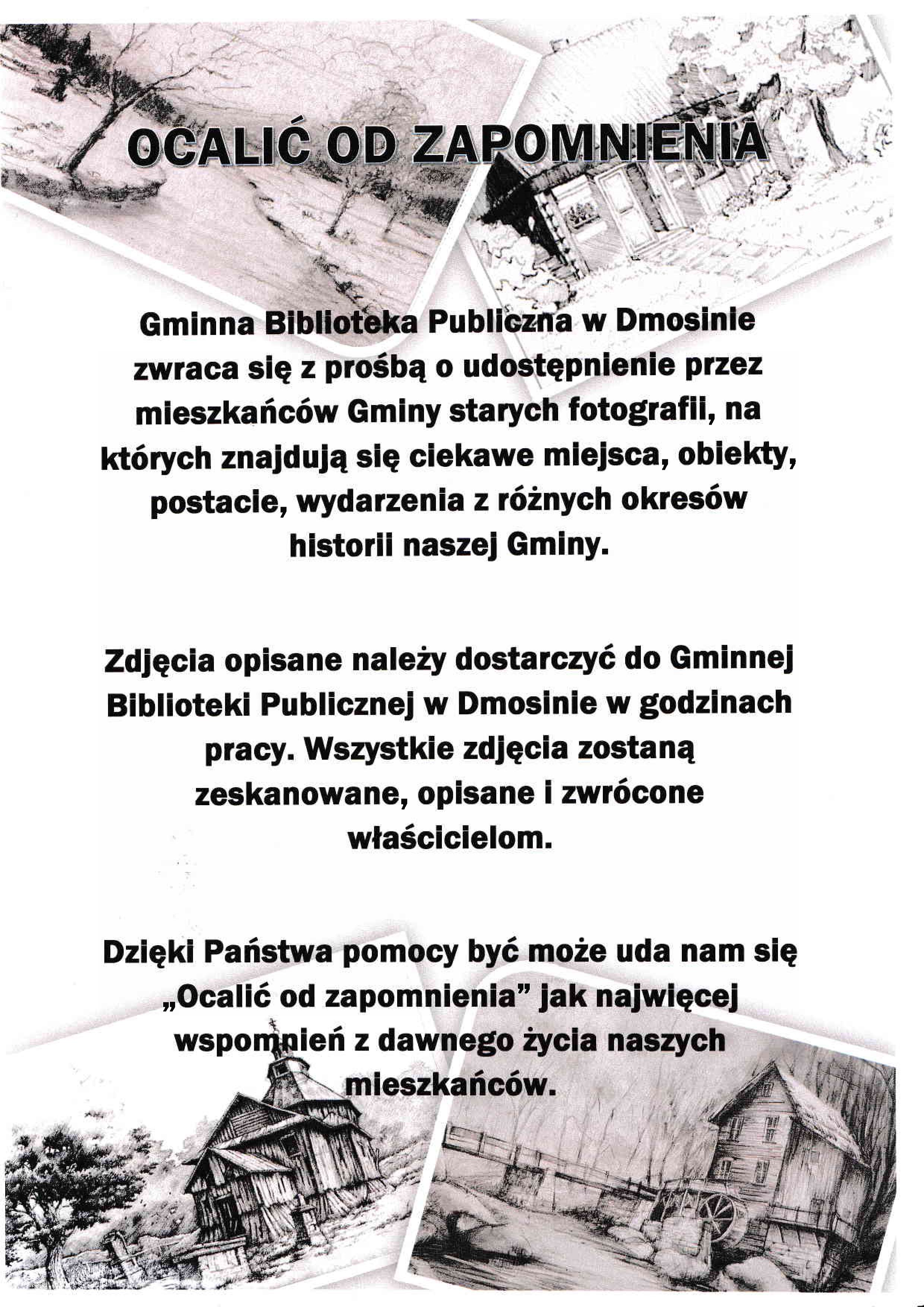 Gminna Biblioteka Publiczna w Dmosinie zwraca się z prośbą o udostępnienie przez mieszkańców Gminy starych fotografii, na których znajdują się ciekawe miejsca, obiekty, postacie, wydarzenia z różnych okresów historii naszej Gminy
