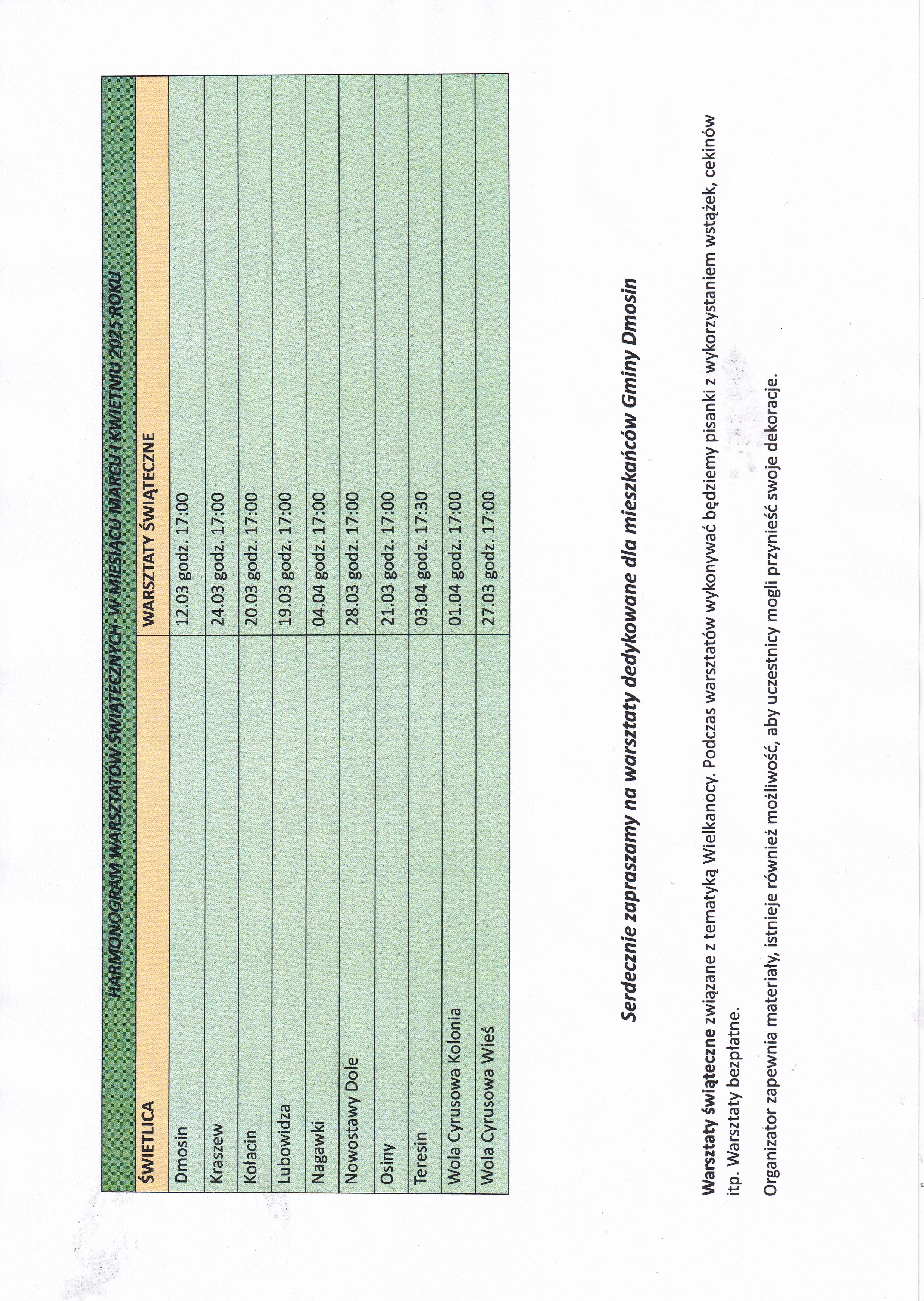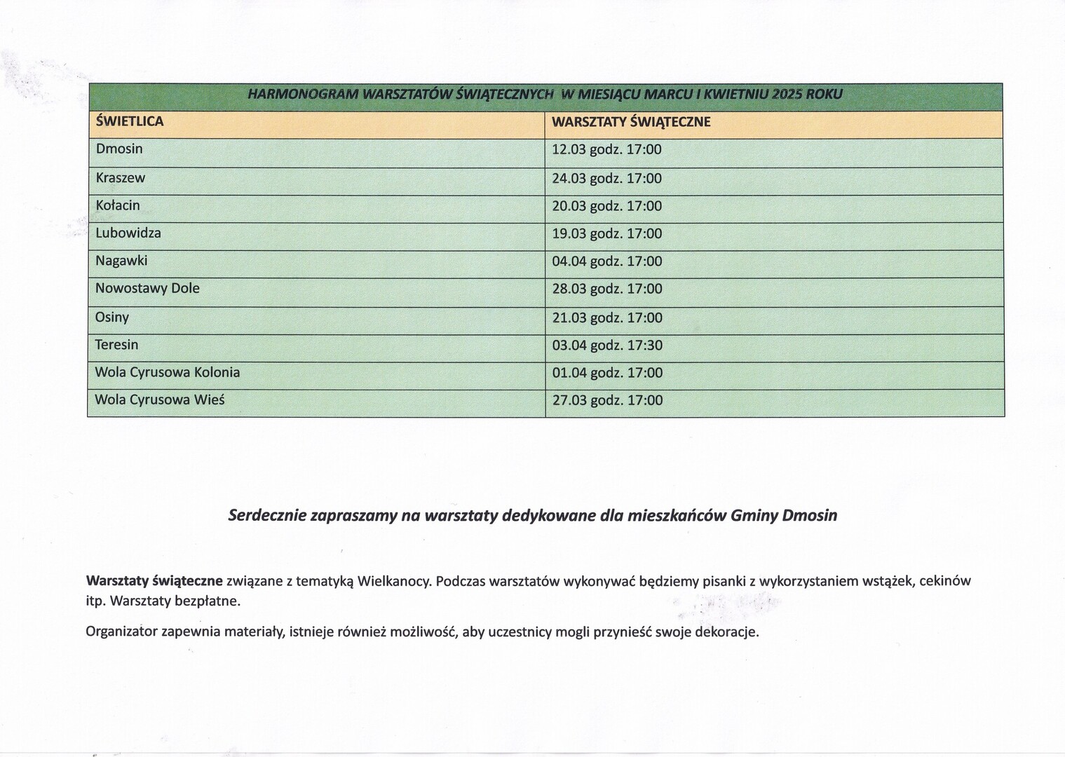 🐣Serdecznie zapraszamy do udziału mieszkańców Gminy Dmosin w bezpłatnych warsztatach o tematyce wielkanocnej w Świetlicach na terenie Gminy Dmosin.Szczegóły w załączniku🐣🐣