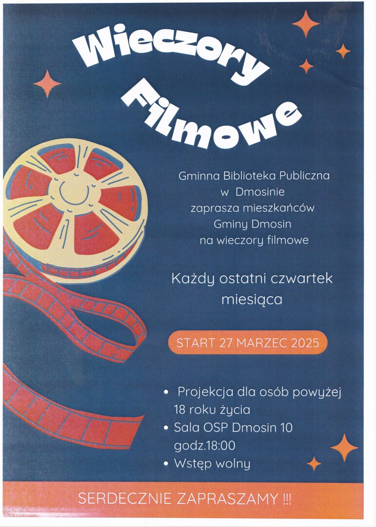 Serdecznie zapraszamy na wieczór filmowy w najbliższy czwartek 27 marca 2025 roku o godzinie 18.00 w Sali OSP Dmosin.Projekcja dla osób powyżej 18 roku życia.Wstęp wolny.Serdecznie zapraszamy