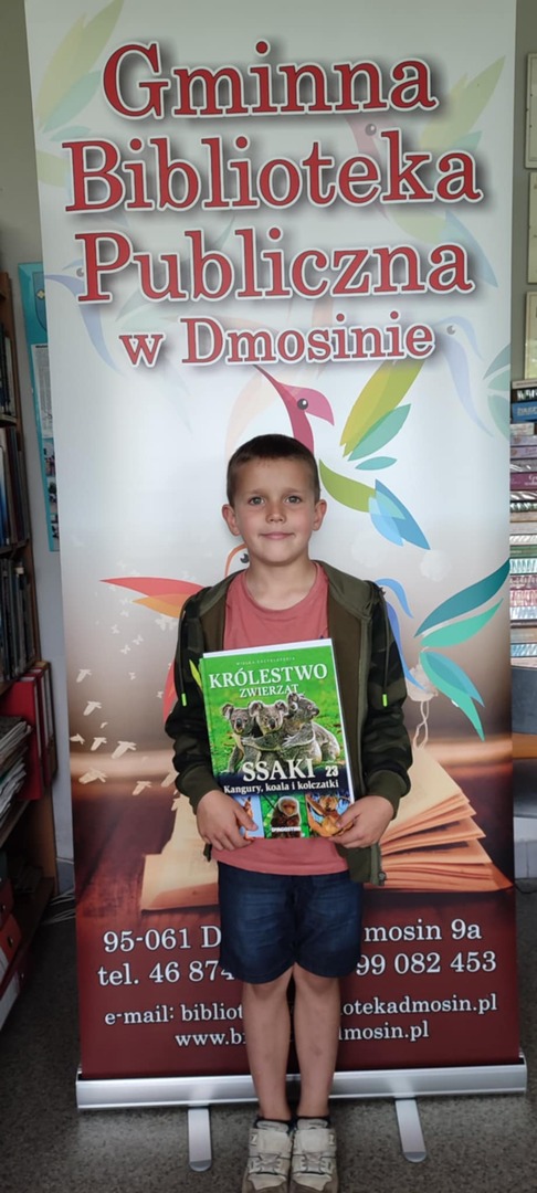 Maciej to kolejny mały czytelnik, który zebrał komplet naklejek za wizyty w bibliotece i został nagrodzony dyplomem i upominkiem