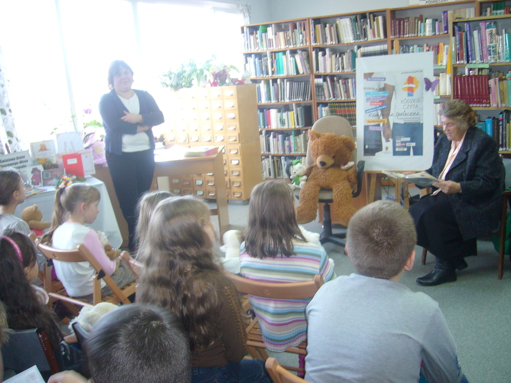 Wybraliśmy największego i najmniejszego misia, które zasiadły na wyeksponowanym fotelu. Nasi goście wysłuchały również ciekawostek o różnych misiach,. Dzieci mogły sprawdzić poziom swoich wiadomości w konkursie o Misiach.Po przeczytaniu tekstów i sprawdzeniu wiedzy przyszedł czas na układanie puzzli z podobiznami misiów z różnych bajek. Dzieciom bardzo podobało się ta edukacja przez zabawę. Podczas każdego spotkania w naszej bibliotece nie może zabraknąć głośnego czytania. Tym razem na spotkanie zaprosiliśmy naszą stałą czytelniczkę panią Jadwigę Pilarską, które przeczytała dzieciom o przygodach Misia Uszatka z książki pana Czesława Janczarskiego.