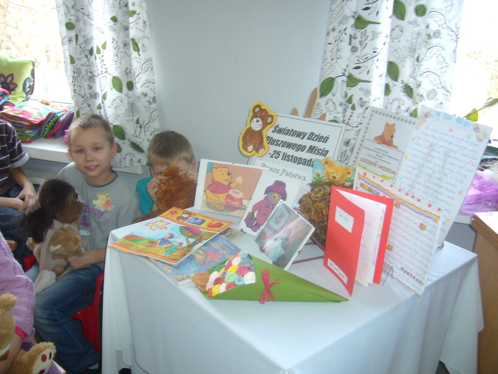 Po przywitaniu dzieci otrzymały do przypięcia na ubranie papierowe misie jako znaczki promujące spotkanie. Następnie wysłuchały historii Pluszowego Misia, po czym przedstawiły misie, które przyniosły ze sobą.