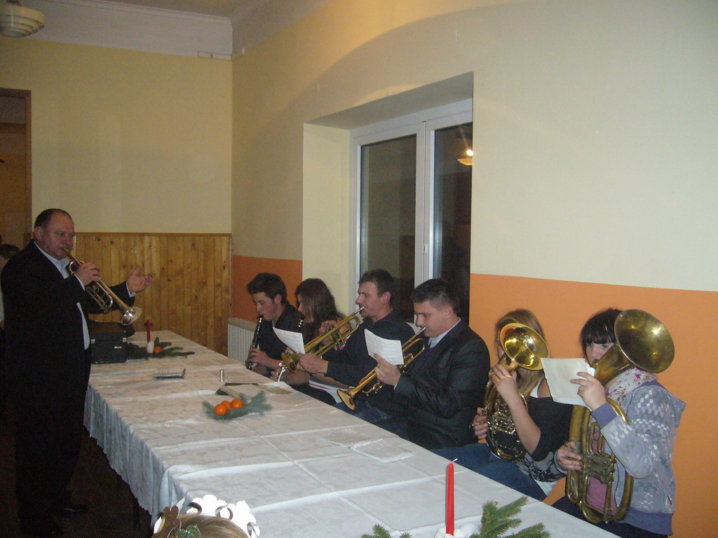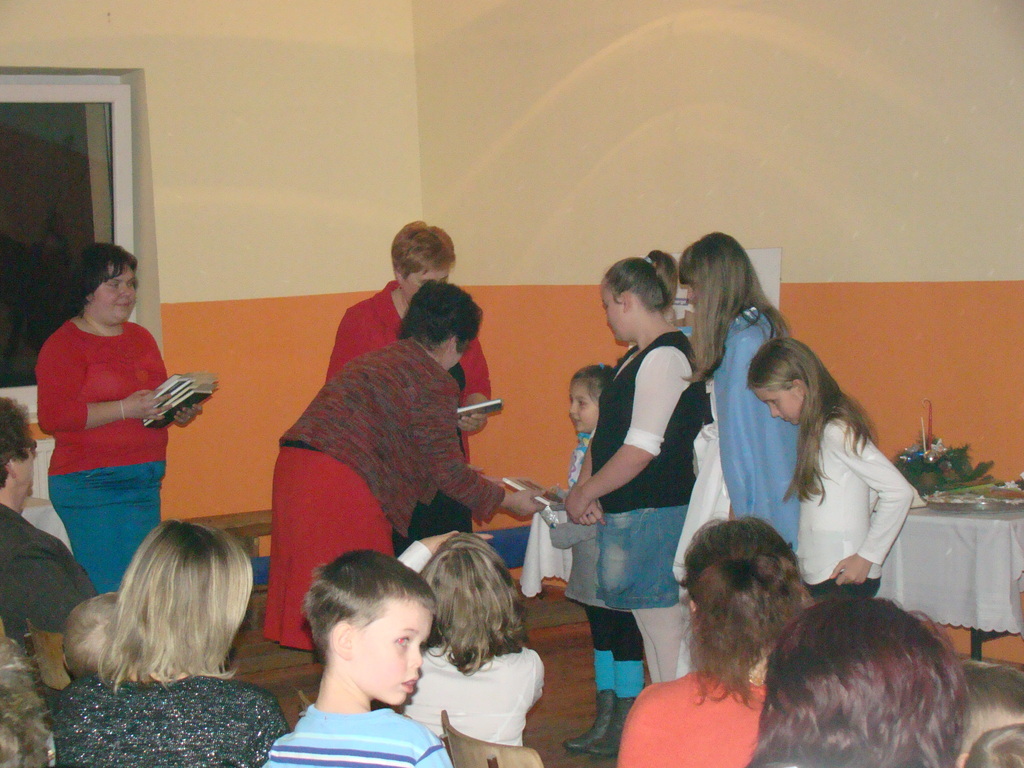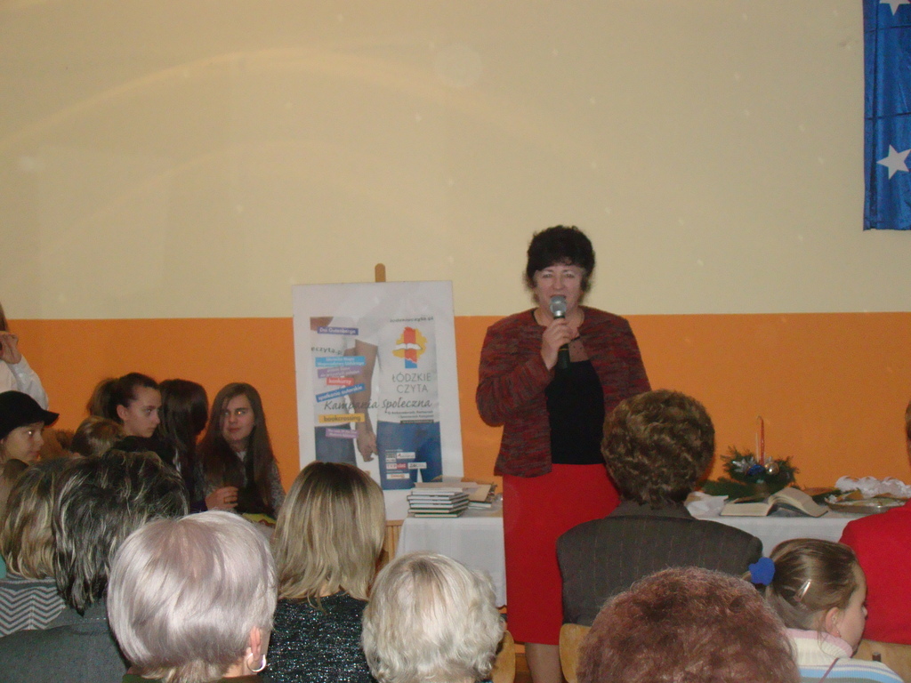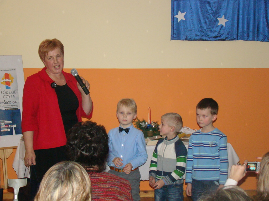 Po jasełkach nastąpiło podsumowanie kampanii „Łódzkie czyta” i wszystkich innych konkursów w których uczestniczyli nasi czytelnicy, a były to konkursy: Konkurs fotograficzny „Z książką mi do twarzy”, „Korespondencja źródłem wiedzy i inspiracji” , „Pisanie Listów do przyszłych pokoleń”. Należy również nadmienić iż trójka naszych dzieci w kategorii do lat 6 zajęła 3 pierwsze miejsca w konkursie „Korespondencja źródłem wiedzy i inspiracji” a byli to: Kacper Kubiak, Dominik Kaczmarski i Kuba Koneczny. Uroczyste wręczenie nagród nastąpiło również na tym spotkaniu, a wszystkim uczestnikom podziękowania i nagrody książkowe. W konkursach łącznie wzięło udział ponad 20 osób. Po podsumowaniu konkursu przyszedł czas , aby wspólnie przełamać się opłatkiem i złożyć sobie życzenia. Na wszystkich czekał zastawiony potrawami wigilijnymi bufet, którymi można było się poczęstować. Oprawę muzyczną spotkania zapewniła Orkiestra Dęta działająca przy Gminnej Bibliotece Publicznej w Dmosinie, która zaprezentowała się w koncercie kolęd.