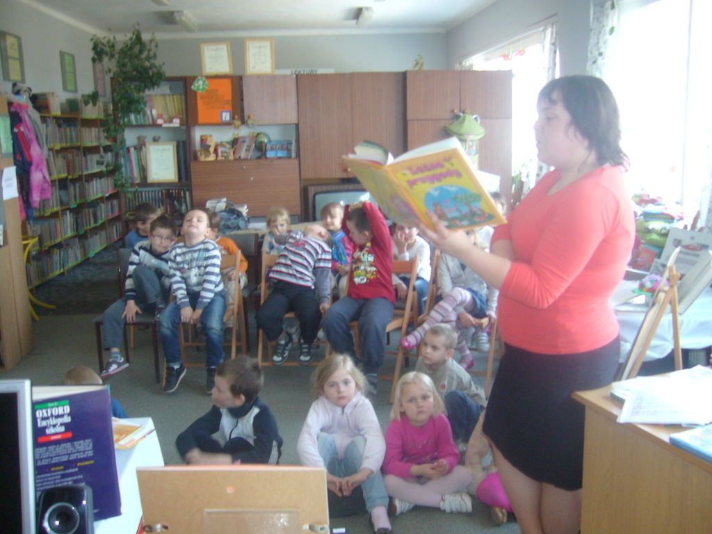 Dzieci dowiedziały się o akcji:„5 minut dla książki-Czytanie pod chmurką”, po czym przeszliśmy do lokalu biblioteki, aby przeprowadzić dalszą część lekcji bibliotecznej Światowego Dnia Książki obchodzonego 23 kwietnia.