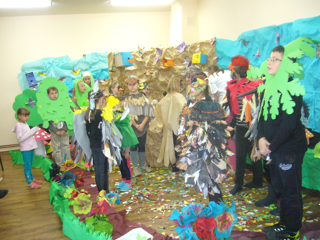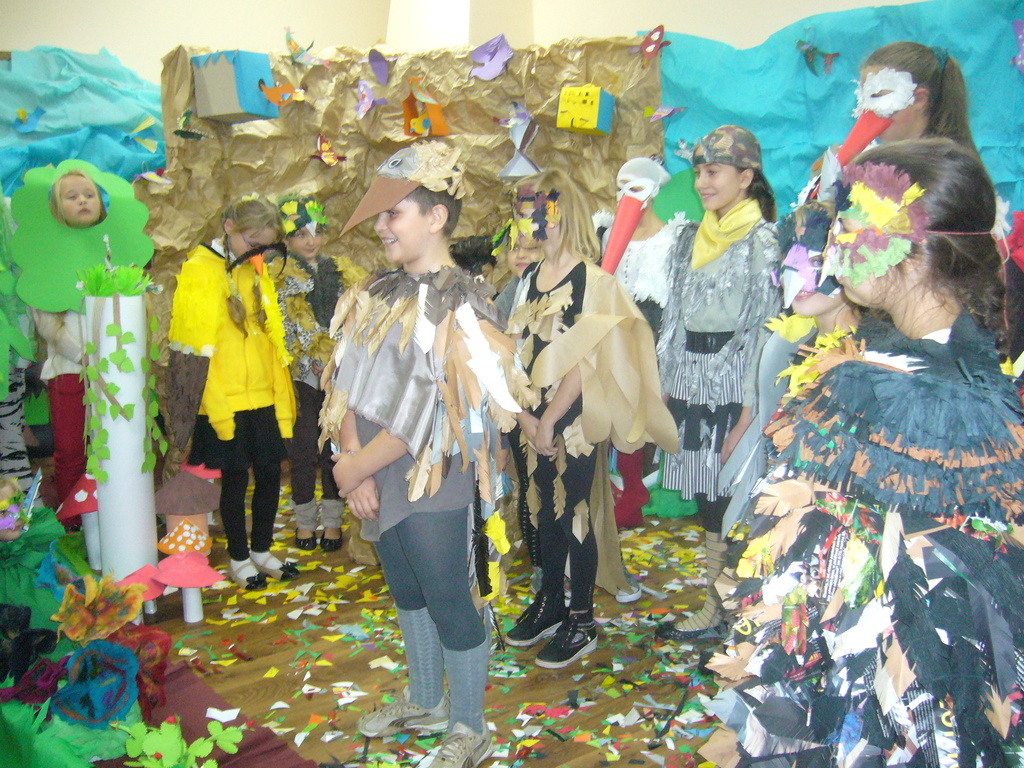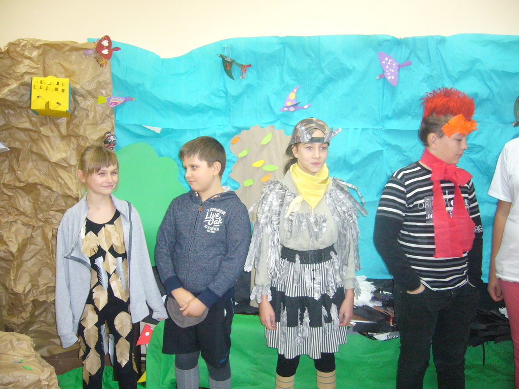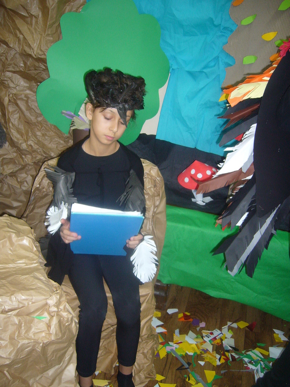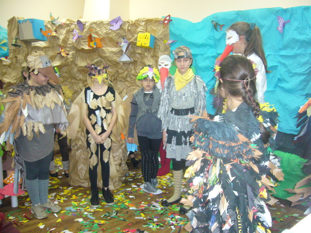 4 października br. Dzieci wcieliły się w role ptaków w kostiumach wykonanych w rodzinie lub w bibliotece czerpiąc inspirację i doświadczenie z wcześniejszych warsztatów Przedstawienie zostało nagrane i zostanie przesłane do oceny na konkurs, który z racji projektu został ogłoszony. Komisja będzie oceniać: scenariusz, grę aktorską , strój oraz scenografię .