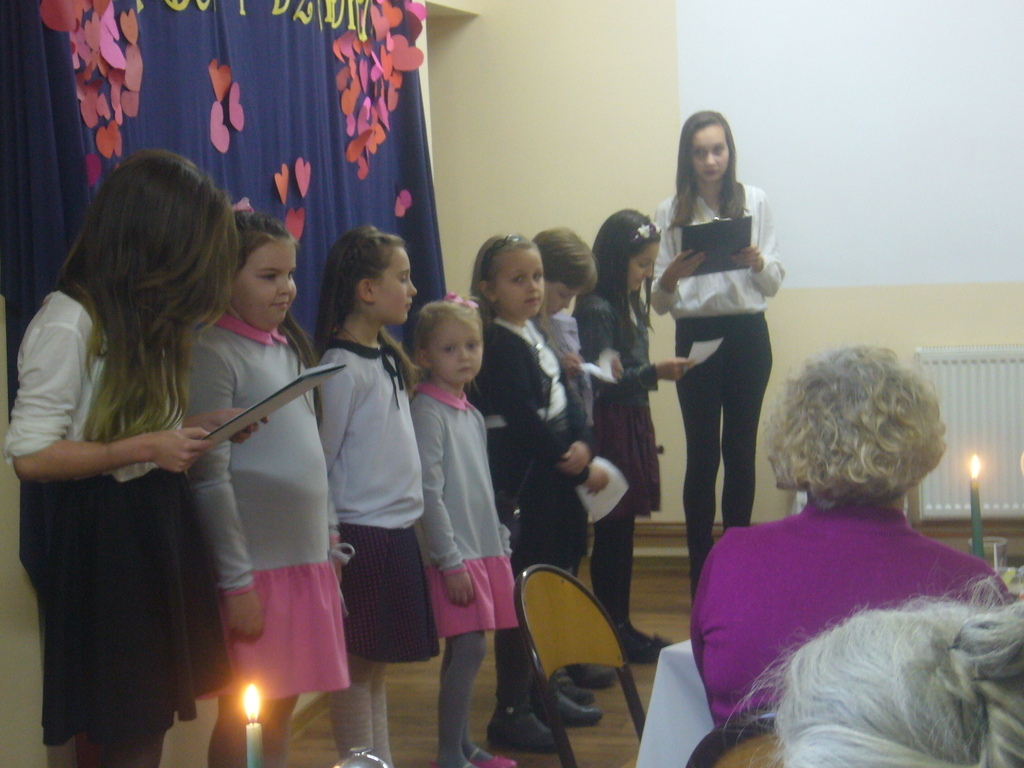 Słowa powitania skierowała do obecnych Pani Halina Grabowicz- Kierownik Gminnej Biblioteki Publicznej w Dmosinie, która przedstawiła krótko historię Dnia Babci Dziadka, zaznaczyła również jak ważną rolę w rodzinach pełnią babcie i dziadkowie po czym zaprosiła do wysłuchania montażu słowno muzycznego w wykonaniu dzieci z Kółka Teatralnego „Teatrałki” działającego przy Bibliotece i Świetlicy w Dmosinie . Po występie, dzieci wręczyły laurki oraz słodkie prezenty babciom i dziadkom.