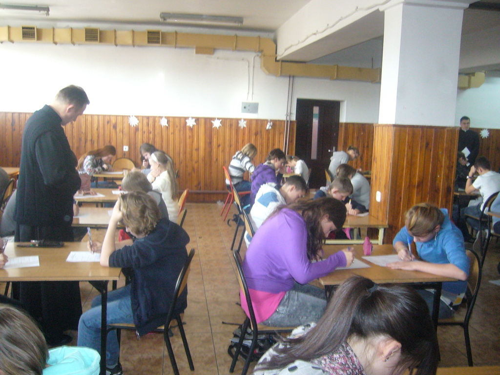 Dla uczestników w/w konkursu został przygotowany test, który zawierał 24 pytania otwarte oraz zamknięte w oparciu o materiały, które dotyczyły Św. Małgorzaty, Św. Andrzeja, Św. Piotra, Św. Józefa, Maryi oraz Św. Pawła ,które uczestnicy otrzymali.