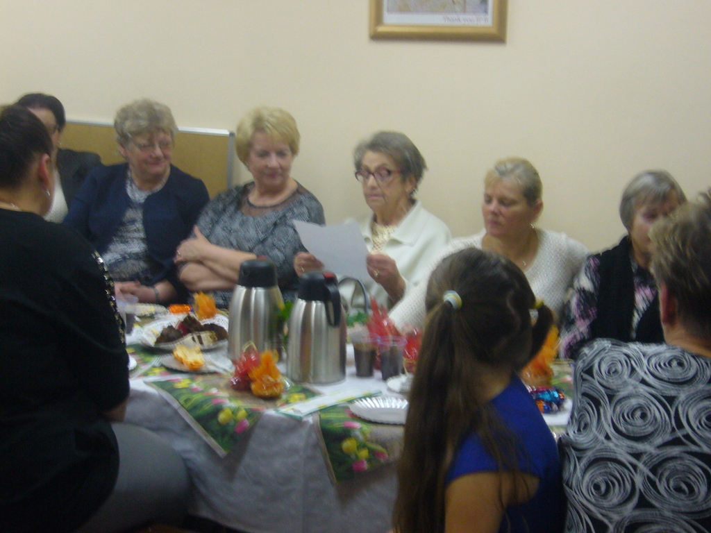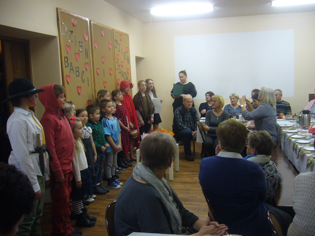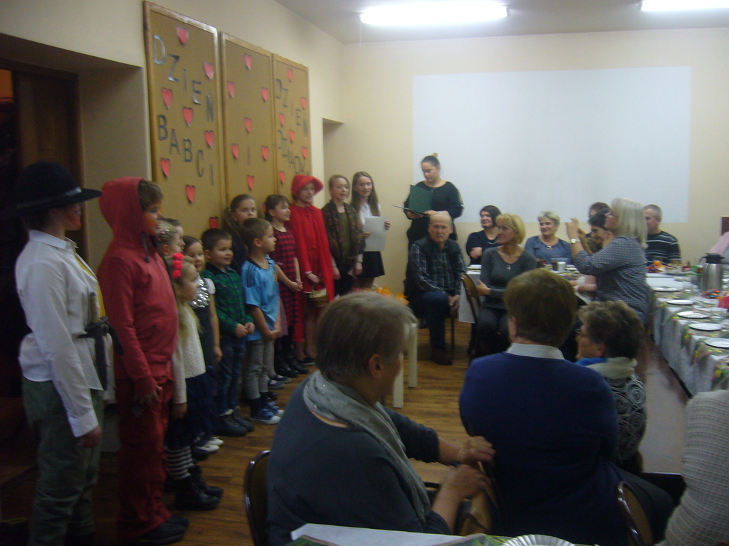 Słowa powitania skierowała do obecnych Pani Julia Miszkiewicz, zaznaczyła jak ważną rolę w rodzinach pełnią babcie i dziadkowie po czym zaprosiły do wysłuchania montażu słowno- muzycznego w wykonaniu dzieci z Kółka Teatralnego „Teatrałki” działającego przy Bibliotece i Świetlicy w Dmosinie. Po występie, dzieci wręczyły laurki oraz słodkie prezenty babciom i dziadkom.
