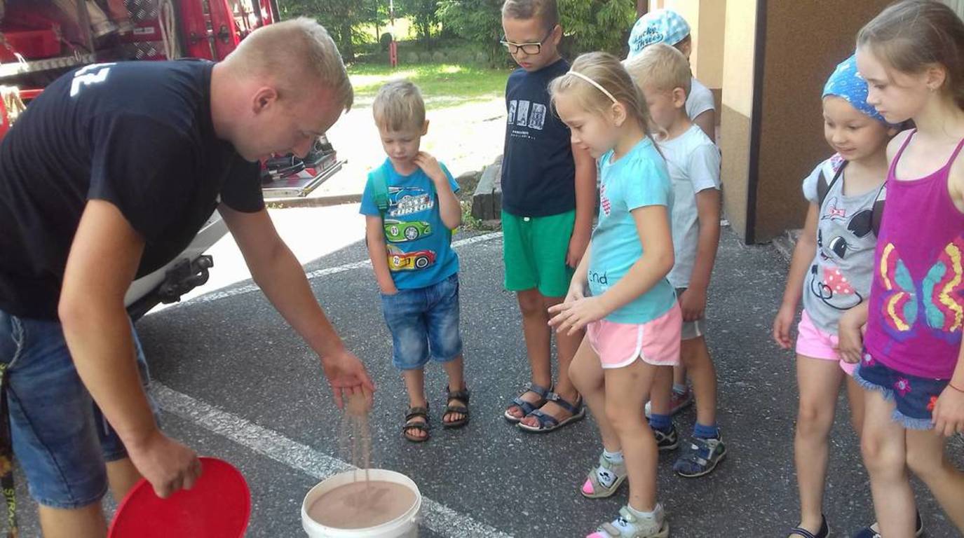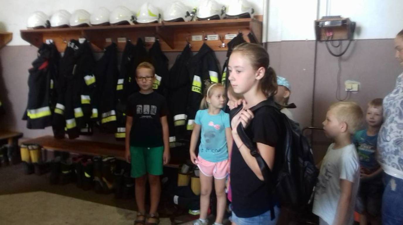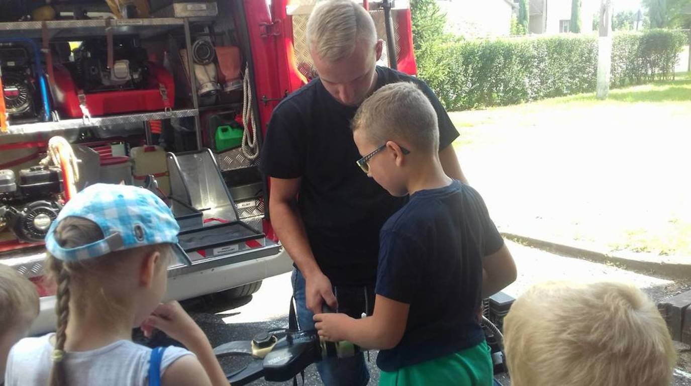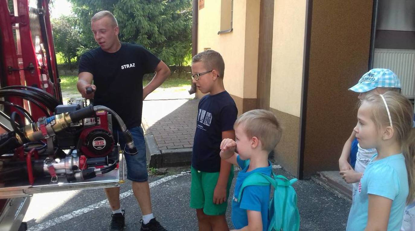W czwartek wybraliśmy się z dziećmi do Ochotniczej Straży Pożarnej. Celem spotkania było zapoznanie dzieci ze specyfiką służby strażaków, uświadomienie, z jakimi zadaniami i niebezpieczeństwami spotykają się na co dzień osoby pełniące służbę. Dzieci w czasie spotkania ze strażakiem w jednostce mogli zapoznać się ze sprzętem oraz poznać metody stosowane w czasie gaszenia pożarów i ratowania ludzi z wypadków. Każdy mógł zobaczyć i dotknąć urządzeń których strażacy używają w akcjach ratowniczych. Dzieciom zaprezentowano działanie sprzętu będącego na wyposażeniu samochodu ratowniczo-gaśniczego GBA MAN , i samochodu technicznego SLRT Ford oraz pokazano i omówiono zakres działań OSP będącej w Krajowym Systemie Ratowniczo Gaśniczym. Dzieci dowiedzieli się, że strażacy nie tylko gaszą pożary, ale działają przy wypadkach drogowych, likwidują gniazda owadów błonkoskrzydłych oraz zwalczają skutki nawałnic. Strażak omówił i zademonstrował Zestaw Medyczny PSP R1,zestaw narzędzi hydraulicznych. Każde dziecko miało możliwość przymierzenia ubrania bojowego oraz hełmu w których strażacy na co dzień wyjeżdżają do zdarzeń, każde z dzieci mogło zwiedzić samochód strażacki w środku.