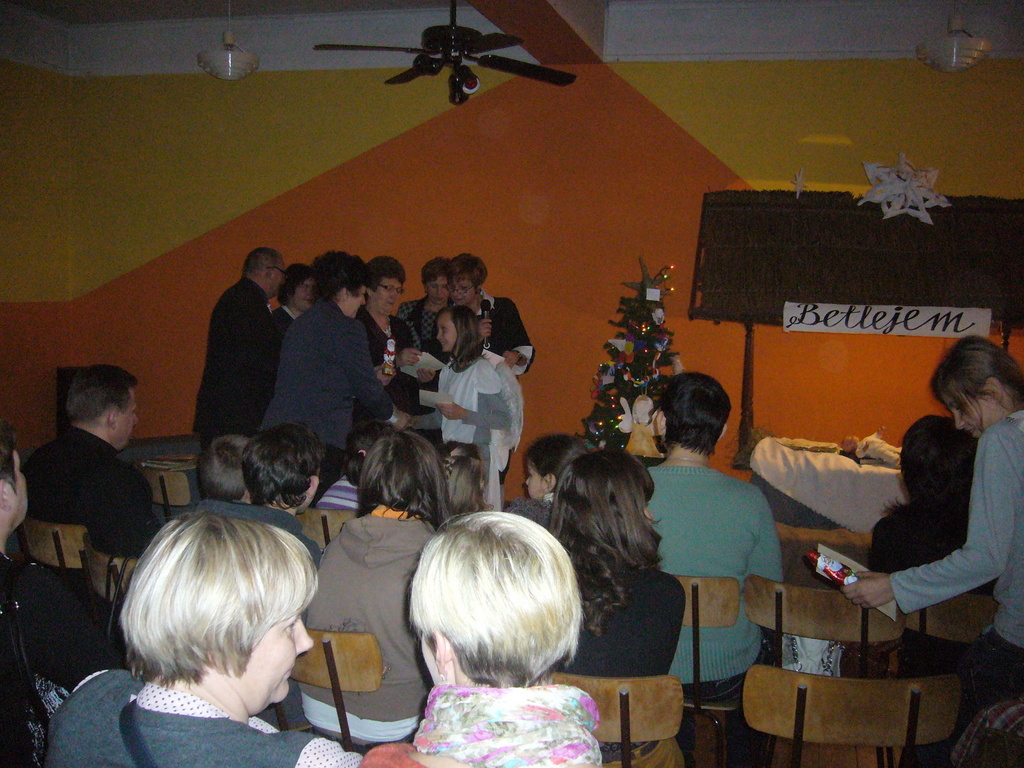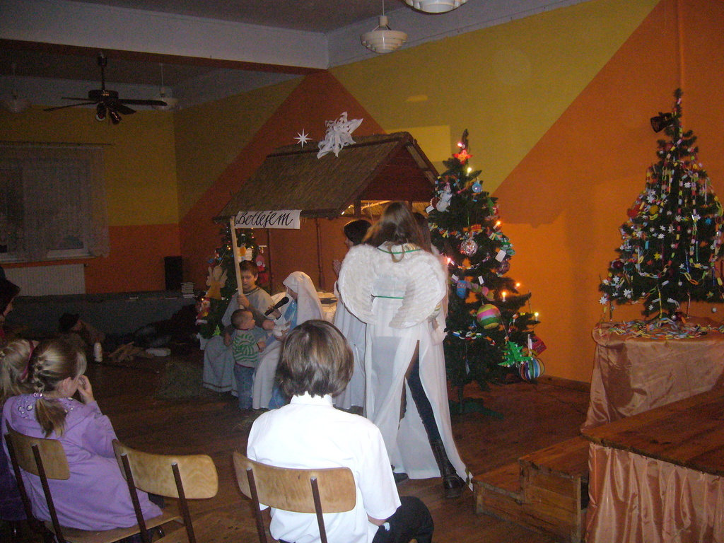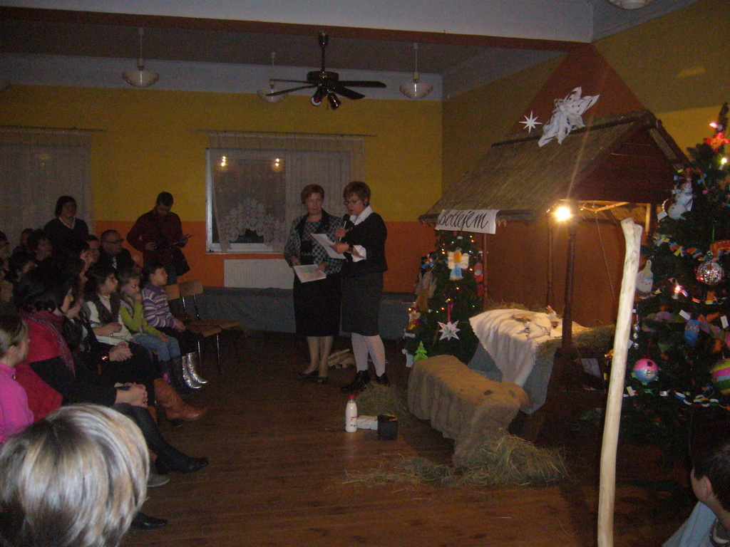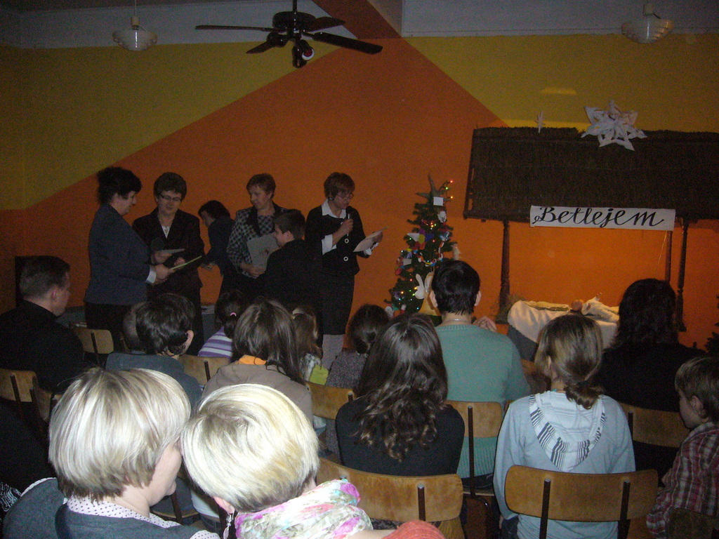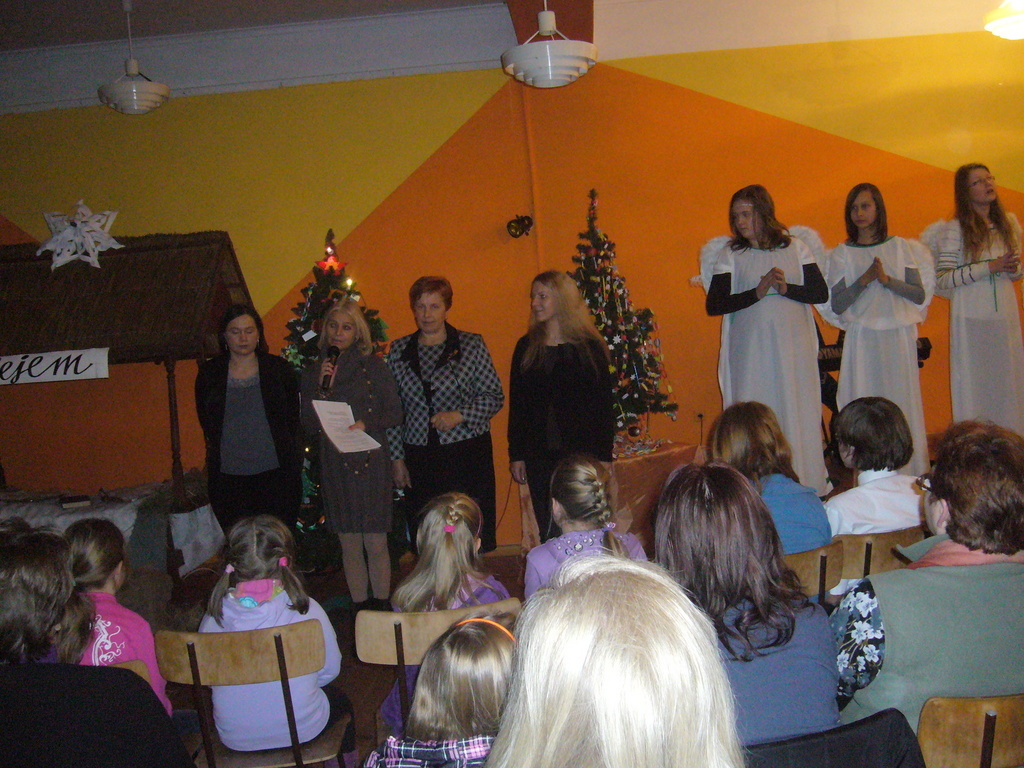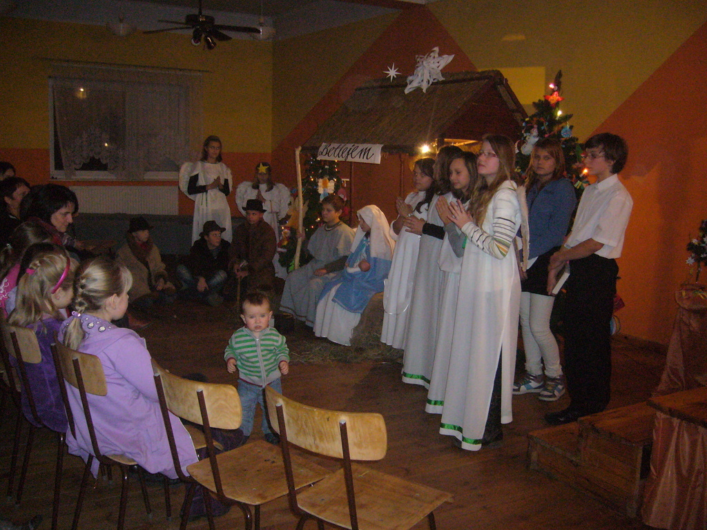 Kolejnym punktem spotkania były Jasełka przygotowane pod kierunkiem Pani Haliny Grabowicz w wykonaniu dzieci i młodzieży W główne role tj. Maryi i Józefa wcielili się Justyna Radzikowska i Radosław Radzikowski .