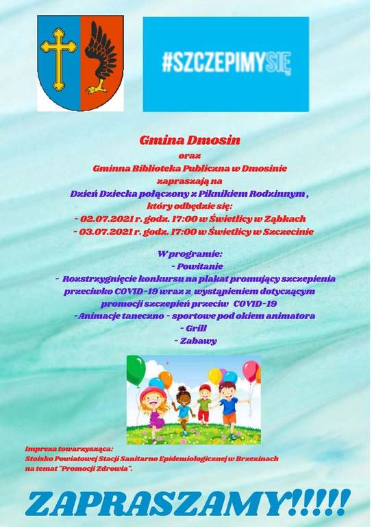 Serdecznie zapraszamy na Dzień Dziecka połączony z Piknikiem Rodzinnym. 02.07.2021 r. godz. 17:00 - Świetlica w Ząbkach 03.07.2021 r. godz. !7:00 - Świetlica w Szczecinie!